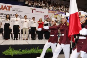 Con la presencia del secretario de Educación de Tamaulipas, Miguel Ángel Valdez García, representante del gobernador Américo Villarreal Anaya, el rector de la UAT puso en marcha el período escolar universitario en donde expresó su mensaje de bienvenida a la comunidad estudiantil, teniendo como marco los honores a los símbolos patrios.